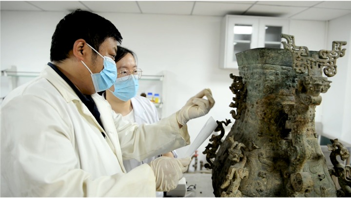此外,為了堅(jiān)持“最小干預(yù)”原則,保證文物真實(shí)性,此次修復(fù)并沒有對(duì)蓮鶴方壺進(jìn)行統(tǒng)一著色。“我們著重清理了有害銹,而記錄著文物信息的無害銹得到原汁原味保留,紅斑處留紅,綠銹處存綠,保留文物的歷史信息?!倍虐舱f。
