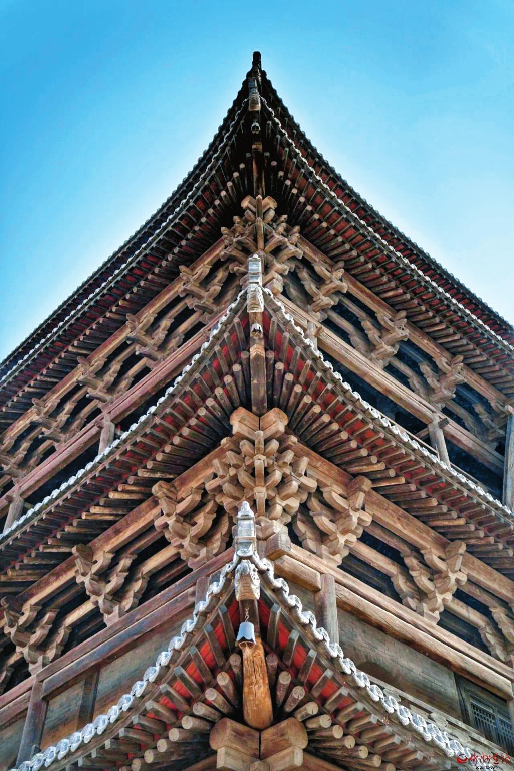 斗拱的分布,除柱頭科和角科外,前后檐明間平身科兩攢,次、梢間和兩山各間皆一攢。二層檐下施五踩雙翹頭,角科加施斜翹頭一縫。三層平座五踩雙翹頭,三層廊下施五踩重昂,三層上檐五踩雙下昂,角科加施角昂和由昂。角科正側兩面于當心翹頭外向增翹頭一列。斗拱制作規(guī)整,結構精巧,構造嚴密適度。