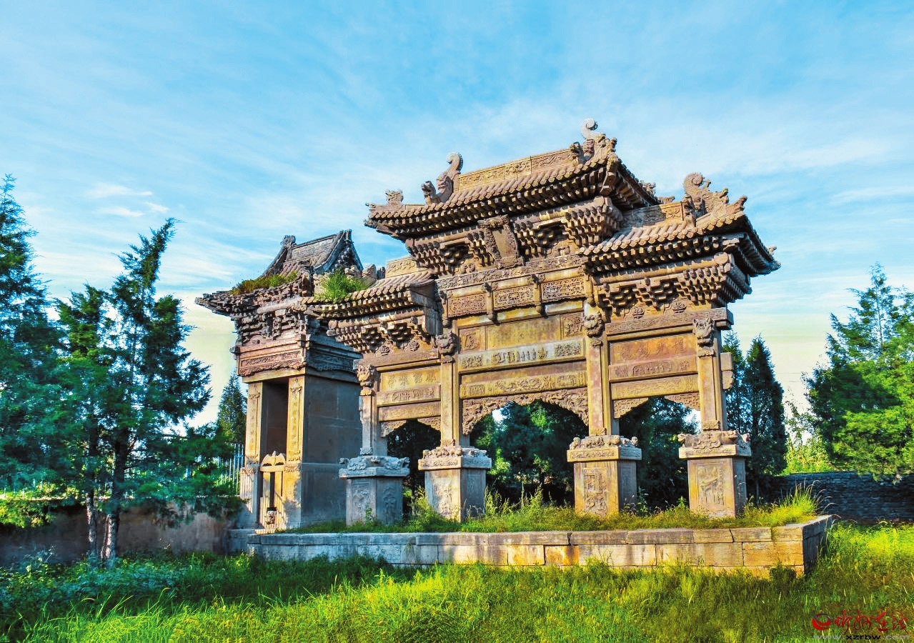 坐落于村中的朱氏牌樓是晚清中儀大夫、陜西延榆綏兵道加鹽運使武訪疇為其母所修的節(jié)孝牌坊。它不僅見證了朱氏家族的輝煌歷史,也反映了當時社會的文化風貌,承載著豐富的歷史文化內涵,為第八批全國重點文物保護單位。牌樓有主坊和配坊兩座,主坊矗立在村內南街,面寬三間,四柱三樓,重檐歇山頂,高近11米、寬15米。欄板內剔底雕刻成一幅幅人物故事圖案,霸王柱間鏤雕丹鳳朝陽。匾形走馬板上書“柏舟矢志”“竹柏流芳”各四字。牌坊下檐明間置匾一塊,書“圣旨”二字,兩次間匾書分別為“懿范”“徽音”。配坊在村南,高8米有余,四柱三門,單檐歇山頂,規(guī)模略小,造型風格與主坊一樣,皆為石雕藝術精品。