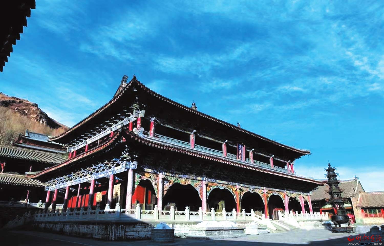 觀音殿后為樓殿,殿內(nèi)有19間石砌窯洞,為僧人寮房。中間的窯洞懸藍(lán)底金字匾額,上書“層巒聳翠”,內(nèi)砌石階連通樓上。二樓建有9個殿堂,分別為三霄殿、三皇殿、三官殿、玉皇殿、伽藍(lán)殿、毗盧殿、藥王殿、羅漢殿、地藏王殿。樓殿后是壯觀的大雄寶殿,殿中主塑釋迦牟尼佛,此外還有十八羅漢。