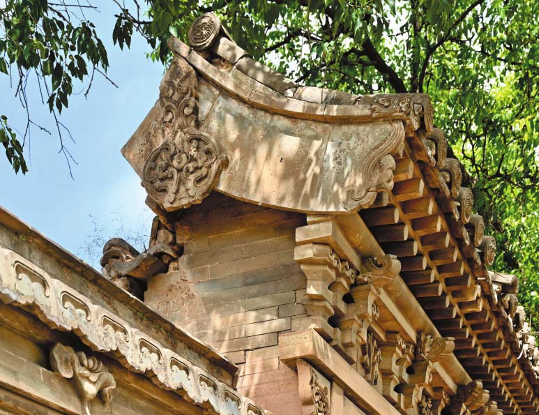 ▲代縣鹿蹄澗村硬山頂磚雕懸魚,菱形石榴、蝙蝠、纏枝瑞草圖案。