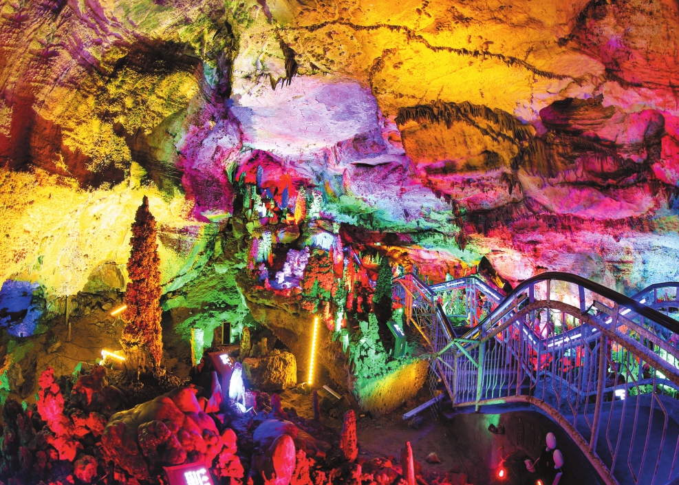 游客沿著精心設計的路線,可觀賞50多個景點。其中“群獅迎賓”,洞口一組石筍形似雄獅列隊,栩栩如生;“金龜出洞”,巨石形成的龜狀奇石,仿佛正探秘人間;“瑤池仙境”與“蓬萊仙島”,燈光下的石幔如天宮云霞;“鎮(zhèn)海寶塔”,高1.8米的花團狀石塔,景象奇麗。最令人驚嘆的是洞內的“冰瀑世界”。在水晶洞和一線天區(qū)域,巖溶從洞頂傾瀉而下,形成各種瀑布奇觀:有如長白山瀑布的白練懸空,有如黃果樹瀑布的氣勢恢宏,還有黃巖大瀑布的玲瓏剔透。一處名為“禹王觀瀑”的景點,更讓游人仿佛看見大禹治水時三過家門而不入的身影。