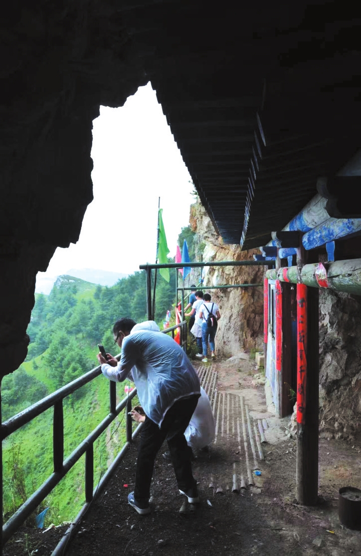 從老君洞主峰下的羊腸小道向前走,可望見(jiàn)峰巒半腰間露出建筑物一角,那便是老君廟了。登臨老君廟,依靠在山的裂縫里開(kāi)鑿出的一條棧道,一腳一蹬,一步一攀,急不得,快不了,就這樣亦步亦趨才能抵達(dá)這座懸在半空的小廟。