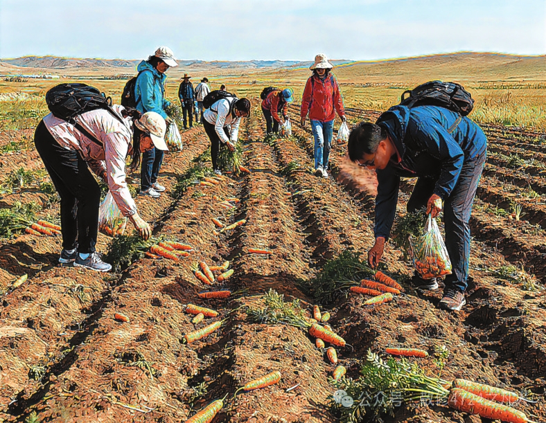 “撿秋”游演繹著“鄉(xiāng)土中國(guó)”的現(xiàn)代篇章。費(fèi)孝通在《鄉(xiāng)土中國(guó)》開(kāi)篇即言“從基層上看去,中國(guó)社會(huì)是鄉(xiāng)土性的”。這種“鄉(xiāng)土性”的核心是人與土地的深度綁定。農(nóng)民靠土地生存,土地是文化認(rèn)同的根基。“撿秋”這種農(nóng)耕活動(dòng),如今以更加鮮活方式延續(xù)下來(lái)。對(duì)農(nóng)民而言,土地不僅是謀生手段,更是安身立命的“精神原鄉(xiāng)”。而城市游客的參與則賦予了“撿秋”新的意義。在城市里待久了,就想蹲在田里感受泥土的溫度,游客“撿秋”體驗(yàn)的是“春種秋收”踏實(shí)感。這種體驗(yàn)式參與是現(xiàn)代人對(duì)鄉(xiāng)土文明的“情感反哺”。游客們彎腰的身影既是對(duì)土地的致敬,也是對(duì)“根”的追尋。他們未必真懂農(nóng)事,但通過(guò)參與“撿秋”完成了對(duì)鄉(xiāng)土文化的認(rèn)同,被撿起的“果實(shí)”從“生存作物”演變?yōu)椤拔幕浇椤?。?dāng)前,內(nèi)蒙古各地推出的挖土豆、烤土豆等旅游項(xiàng)目是對(duì)鄉(xiāng)土資源的文化再“編碼”,當(dāng)土豆從田間走向游客的后備箱,“鄉(xiāng)土中國(guó)”便獲得了更加豐富的表達(dá)。