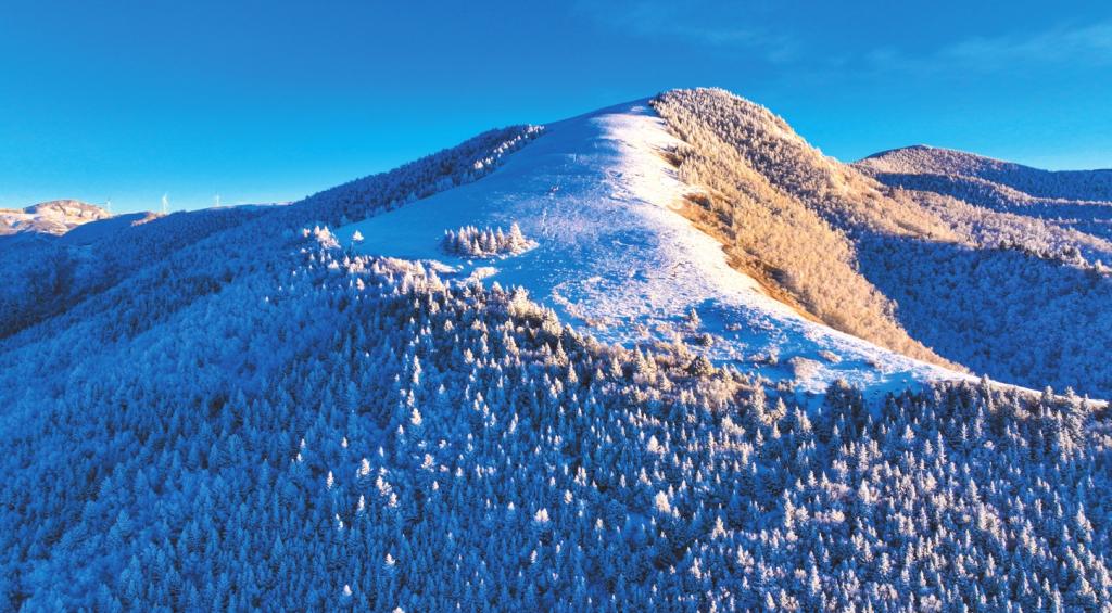 冬之凈,返璞歸真的意蘊。當(dāng)一場大雪如期而至,金山梁便徹底沉靜下來,進入一個冰雕玉砌的童話世界。梁頂之上,積雪平整如鏡,宛如瓊瑤鋪地,反射著清冷而純粹的日光。而當(dāng)陽光突破云層,照射在冰面上,則光芒閃耀,令人不敢直視。松枝上堆滿了蓬松的積雪,傲立于山崖,盡顯在嚴(yán)酷中堅守的堅韌品格;山間那些奇形怪狀的巖石,覆上白霜后,更是空蒙清靈,意韻悠長。生命的痕跡并未完全消失,偶有野兔為了覓食奔躍而過,在雪地上留下一串輕盈的足跡,但轉(zhuǎn)瞬便被新雪覆蓋,似乎了無痕跡;時有耐寒的鳥兒掠崖飛去,翅羽間振落的冰晶,在空中劃出一道優(yōu)美的弧線。
