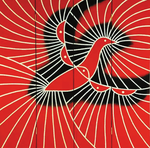 藝術(shù)家潘草原的《上升勢態(tài)》系列在制作方法上延續(xù)傳統(tǒng)工藝,使用不同質(zhì)地的瓦灰調(diào)入大漆制作背景,在表現(xiàn)形式上徹底顛覆固有的畫面結(jié)構(gòu),由符號化的裝飾元素組成。部落文化圖騰的抽象紋樣代表某種精神象征,將肉眼不可見的精神現(xiàn)象物質(zhì)化。有別于傳統(tǒng)“平光亮”的打磨工藝,藝術(shù)家利用瓦灰打磨后的不同灰度層次,在畫面中形成似霧朦朧的氤氳氛圍。鑲嵌的寶石、金屬和螺鈿,不同材質(zhì)折射的光澤質(zhì)感與大漆的黑、瓦灰形成鮮明對比,符號圖騰在二維平面中顯示一種“上升勢態(tài)”。如今,在世界文明交流互鑒的新時代,深得中華傳統(tǒng)文化神韻的大漆藝術(shù)應(yīng)該秉持兼收并蓄的原則,煥發(fā)出新的時代光彩。(黃雨田)
