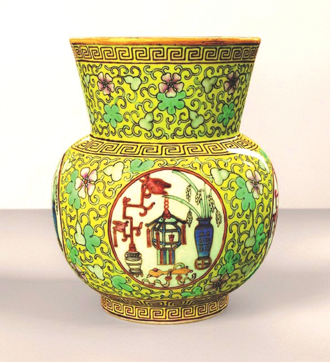 故宮博物院收藏的清代粉彩葫蘆萬(wàn)代五谷豐登紋渣斗,內(nèi)壁繪粉彩纏枝葫蘆紋,藤蔓相連,花果繁茂,寓意“子孫綿延”“多子多?!?;外壁黃地亦繪相同葫蘆紋,設(shè)四處圓形開(kāi)光,內(nèi)有宮燈、花瓶、如意、稻穗等,寓意“平安如意”“五谷豐登”。開(kāi)光內(nèi)花瓶飾“囍”字,表明為皇帝大婚用瓷,既祈子嗣繁衍,又添喜慶吉祥。整器色彩明艷,紋飾繁密華麗,盡顯清代晚期宮廷裝飾的典型風(fēng)格。
