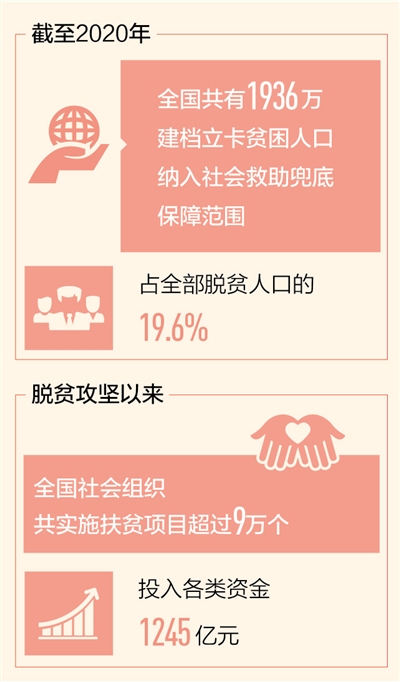 民政部門引導(dǎo)社會組織、慈善力量、專業(yè)社工、志愿者參與脫貧攻堅(jiān),使兜底保障既有力度,更有溫度。脫貧攻堅(jiān)以來,全國社會組織共實(shí)施扶貧項(xiàng)目超過9萬個,投入各類資金1245億元,為決戰(zhàn)決勝脫貧攻堅(jiān)作出了重要貢獻(xiàn)。