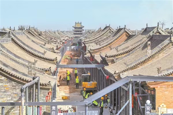 ▲古城正打通“新筋絡(luò)” 設(shè)置臨時橋架,改遷水、電、網(wǎng)絡(luò)線路,請專家勘察監(jiān)測、制定優(yōu)化施工方案,分區(qū)分段、多點(diǎn)錯峰……參建人員在不破壞古城原貌的情況下,努力采取不同方式為每條街巷重塑地下經(jīng)絡(luò)。在多方努力下,改造項(xiàng)目已經(jīng)如期完工。平遙縣委書記魏江峰表示,項(xiàng)目著眼于改善古城民生和旅游品質(zhì),既涉及古城文物保護(hù)、民居安全防護(hù),又涉及居民民生保障、旅游秩序維護(hù),因此在施工過程中以更高標(biāo)準(zhǔn)、更嚴(yán)要求和更實(shí)措施,做細(xì)做優(yōu)安全服務(wù)工作,讓古城居民和游客早日受益。 如今,古城依舊人來人往,舊韻尤存。但在人們腳踏而過的磚石之下,全新的城市脈絡(luò)正奮力涌動,為老城帶來新生。 激活古城,古建繁榮 實(shí)現(xiàn)“一城兩寺”一體化云端監(jiān)測全覆蓋,規(guī)劃建設(shè)平遙非遺數(shù)字展示館,打造“平遙智慧大腦”,設(shè)計(jì)平遙Logo……2022年10月,隨著《加強(qiáng)平遙古城保護(hù)建設(shè)國際知名旅游目的地行動方案》的印發(fā),平遙古城開始加速建設(shè)國際知名旅游目的地。 “方案通過對平遙古城現(xiàn)狀的精準(zhǔn)研判,提出了平遙古城的文物保護(hù)、古城基礎(chǔ)設(shè)施水平提升、古城內(nèi)部監(jiān)管、非物質(zhì)文化遺產(chǎn)的保護(hù)推廣、特色傳統(tǒng)產(chǎn)業(yè)發(fā)展、豐富文旅產(chǎn)品供給以及資金支持等方面的明確目標(biāo)?!逼竭b縣住建局黨組成員趙基平表示,《行動方案》內(nèi)容詳盡、準(zhǔn)確、具體,為今后平遙古城發(fā)展指明了方向。目前,已還原72條街巷、修繕126所院落,投資8億元完成61處因汛損毀城墻修繕,鎮(zhèn)國寺古建筑及彩塑壁畫數(shù)字化保護(hù)項(xiàng)目等20處國保文物數(shù)字化活態(tài)保護(hù)基本完成,引導(dǎo)社會力量參與文物保護(hù)開發(fā)與利用,取得一定成效。