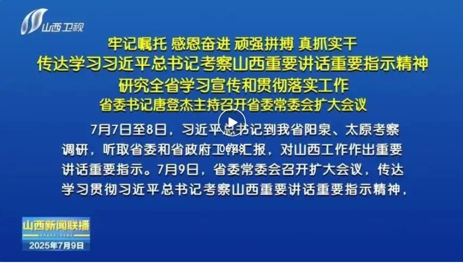 7月7日至8日,習(xí)近平總書記到我省陽泉、太原考察調(diào)研,聽取省委和省政府工作匯報(bào),對山西工作作出重要講話重要指示。7月9日,省委常委會(huì)召開擴(kuò)大會(huì)議,傳達(dá)學(xué)習(xí)貫徹習(xí)近平總書記考察山西重要講話重要指示精神,認(rèn)真落實(shí)黨中央關(guān)于促進(jìn)中部地區(qū)加快崛起、推動(dòng)黃河流域生態(tài)保護(hù)和高質(zhì)量發(fā)展等戰(zhàn)略部署,堅(jiān)持穩(wěn)中求進(jìn)工作總基調(diào),完整準(zhǔn)確全面貫徹新發(fā)展理念,統(tǒng)籌好發(fā)展和安全,努力在推動(dòng)資源型經(jīng)濟(jì)轉(zhuǎn)型發(fā)展上邁出新步伐,奮力譜寫三晉大地推進(jìn)中國式現(xiàn)代化新篇章。省委書記唐登杰主持會(huì)議。