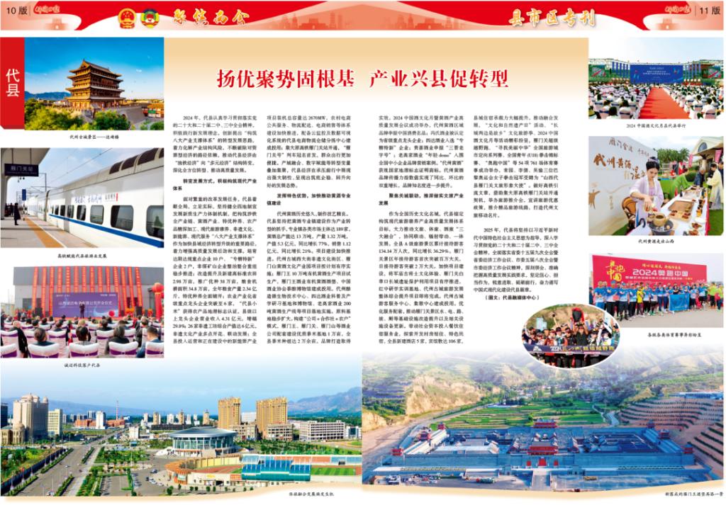 轉(zhuǎn)變發(fā)展方式,積極構(gòu)筑現(xiàn)代產(chǎn)業(yè)體系面對(duì)繁重的改革發(fā)展任務(wù),代縣著眼全局,立足實(shí)際,堅(jiān)持健全因地制宜發(fā)展新質(zhì)生產(chǎn)力體制機(jī)制,把構(gòu)筑涉鐵全產(chǎn)業(yè)鏈、黃酒產(chǎn)業(yè)、特優(yōu)種養(yǎng)、農(nóng)產(chǎn)品精深加工、現(xiàn)代旅游康養(yǎng)、非遺文化、新能源、現(xiàn)代服務(wù)“八大產(chǎn)業(yè)支撐體系”作為加快縣域經(jīng)濟(jì)轉(zhuǎn)型升級(jí)的重要路徑,著力增強(qiáng)高質(zhì)量發(fā)展后勁和支撐。培育達(dá)限達(dá)規(guī)重點(diǎn)企業(yè)10戶、“專精特新”企業(yè)2戶,非煤礦山企業(yè)整治整合重組穩(wěn)步推進(jìn);改造提升及新建高標(biāo)準(zhǔn)農(nóng)田2.98萬畝,推廣優(yōu)種38萬畝,糧食機(jī)耕面積34.8萬畝,全年糧食產(chǎn)量2.34億斤,特優(yōu)種養(yǎng)全面鋪開;農(nóng)業(yè)產(chǎn)業(yè)化省級(jí)重點(diǎn)龍頭企業(yè)突破至6家,“代縣小米”獲得農(nóng)產(chǎn)品地理標(biāo)志認(rèn)證,縣級(jí)以上龍頭企業(yè)營(yíng)業(yè)收入4.31億元,增幅29.8%;26家非遺工坊綜合產(chǎn)值達(dá)6億元,非遺文化產(chǎn)業(yè)多點(diǎn)開花、聯(lián)動(dòng)發(fā)展;全縣投入運(yùn)營(yíng)和正在建設(shè)中的新能源產(chǎn)業(yè)項(xiàng)目裝機(jī)總?cè)萘窟_(dá)2670MW,農(nóng)村電商公共服務(wù)、物流配送、電商銷售等體系建設(shè)加快推進(jìn),配備云監(jiān)控及數(shù)據(jù)可視化系統(tǒng)的代縣電商物流倉(cāng)儲(chǔ)分揀中心建成投用;集大原高鐵雁門關(guān)站開通,“雁門關(guān)號(hào)”列車冠名首發(fā),群眾出行更加便捷。產(chǎn)城融合、數(shù)字賦能等轉(zhuǎn)型變量疊加集聚,代縣經(jīng)濟(jì)在承壓前行中展現(xiàn)出強(qiáng)大韌性,呈現(xiàn)出筑底企穩(wěn)、回升向好的發(fā)展態(tài)勢(shì)。